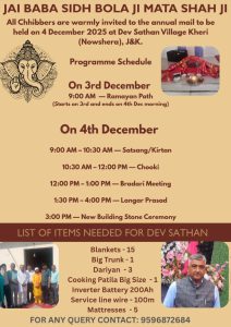 नौशहरा तहसील के गांव खेड़ी स्थित देव स्थान बाबा सिध्द भोला जी एवं माता शाह जी की प्रबंधक कमेटी ने वर्ष 2025 में वार्षिक सम्मेलन की तिथि का औपचारिक ऐलान कर दिया है।