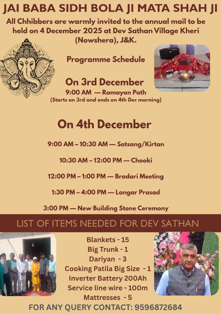 सभा ने समस्त छिब्बर परिवारों से आग्रह किया है कि वे इस पावन सम्मेलन में उपस्थित होकर बाबा सिध्द भोला जी एवं माता शाह जी की कृपा प्राप्त करें और अपने परिवार सहित इस धार्मिक मिलन समारोह का हिस्सा बनें।