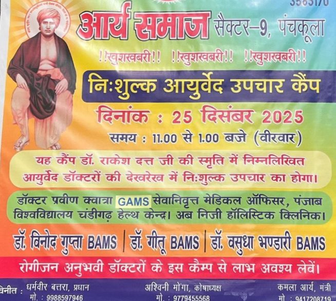 मोहयाल समुदाय के सुप्रसिद्ध विद्वान तथा पंजाब विश्वविद्यालय, चंडीगढ़ के रक्षा अध्ययन विभाग के पूर्व अध्यक्ष स्व. प्रो. राकेश कुमार दत्ता के जन्मदिवस अवसर पर आज उनकी पुण्य-स्मृति में एक निःशुल्क आयुर्वेदिक चिकित्सा शिविर का आयोजन किया गया। यह शिविर सेक्टर–9 स्थित आर्य समाज मंदिर में आयोजित हुआ, जिसका प्रबंधन उनकी बहन प्रो. मीनू दत्ता (सेवानिवृत्त, राजनीतिक विज्ञान विभाग, पंजाब विश्वविद्यालय एवं लाइफ मेंबर, मोहयाल सभा पंचकूला) ने किया।