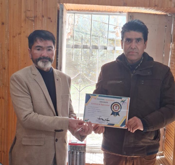 गणतंत्र दिवस पर सुरनकोट के एसडीएम द्वारा द्राबा, पूंछ निवासी श्री पुनीत दत्ता, सहायक अभियंता (AE), जेपीडीसीएल को जनहित में किए गए उनके उत्कृष्ट कार्यों के लिए सम्मानित किया गया।